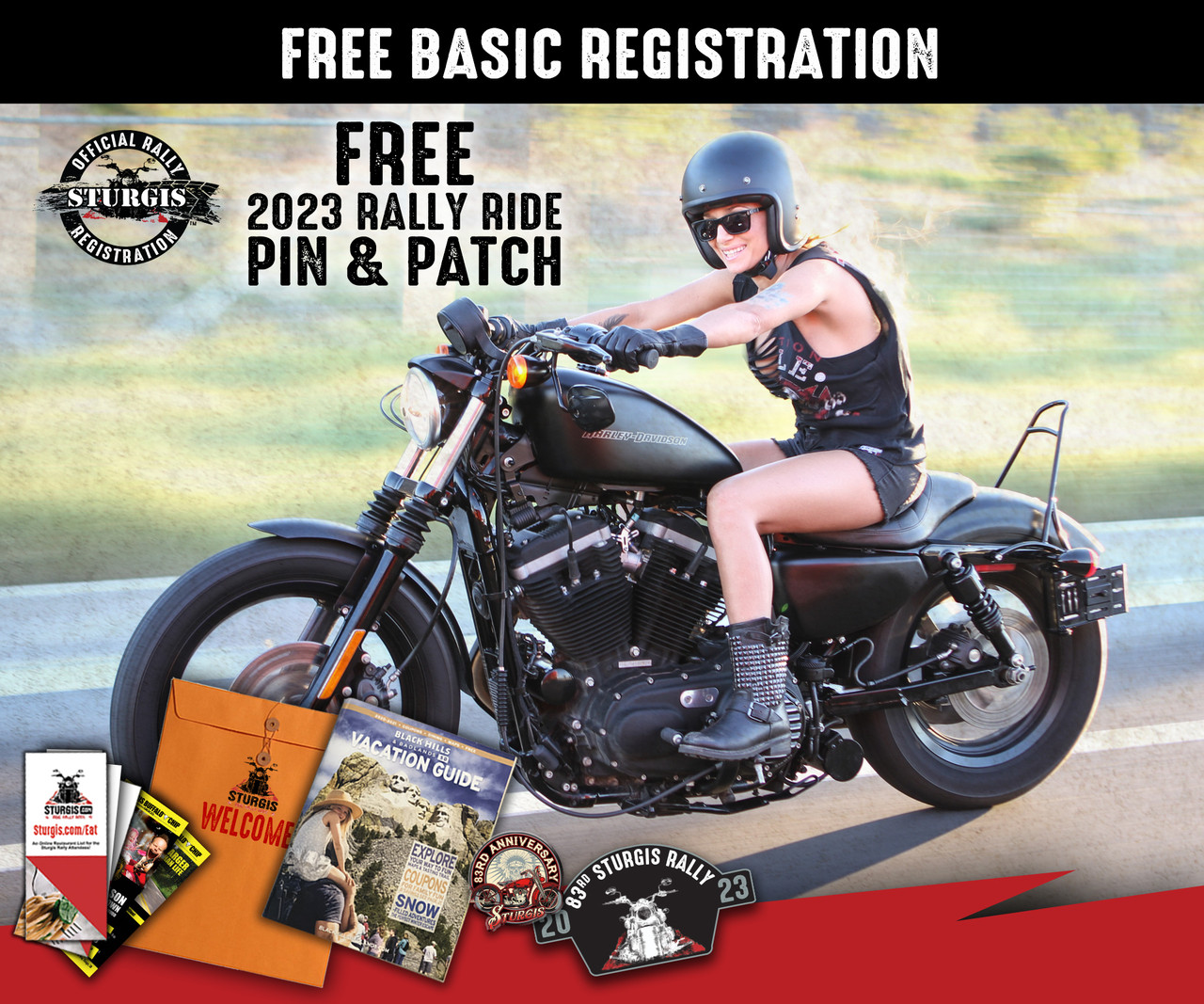 Your Sturgis.com Official Sturgis Rally registration packet is chock full of helpful maps, money-saving coupons and insider information that’ll help you get the most out of your trip. Not to mention, it’ll set you up with Sturgis patches and pins that’ll help you remember your vacation for years to come. Begin your Sturgis Motorcycle Rally adventure by registering online and picking up your Sturgis.com Rally Ride Pin, Patch and Welcome Packet